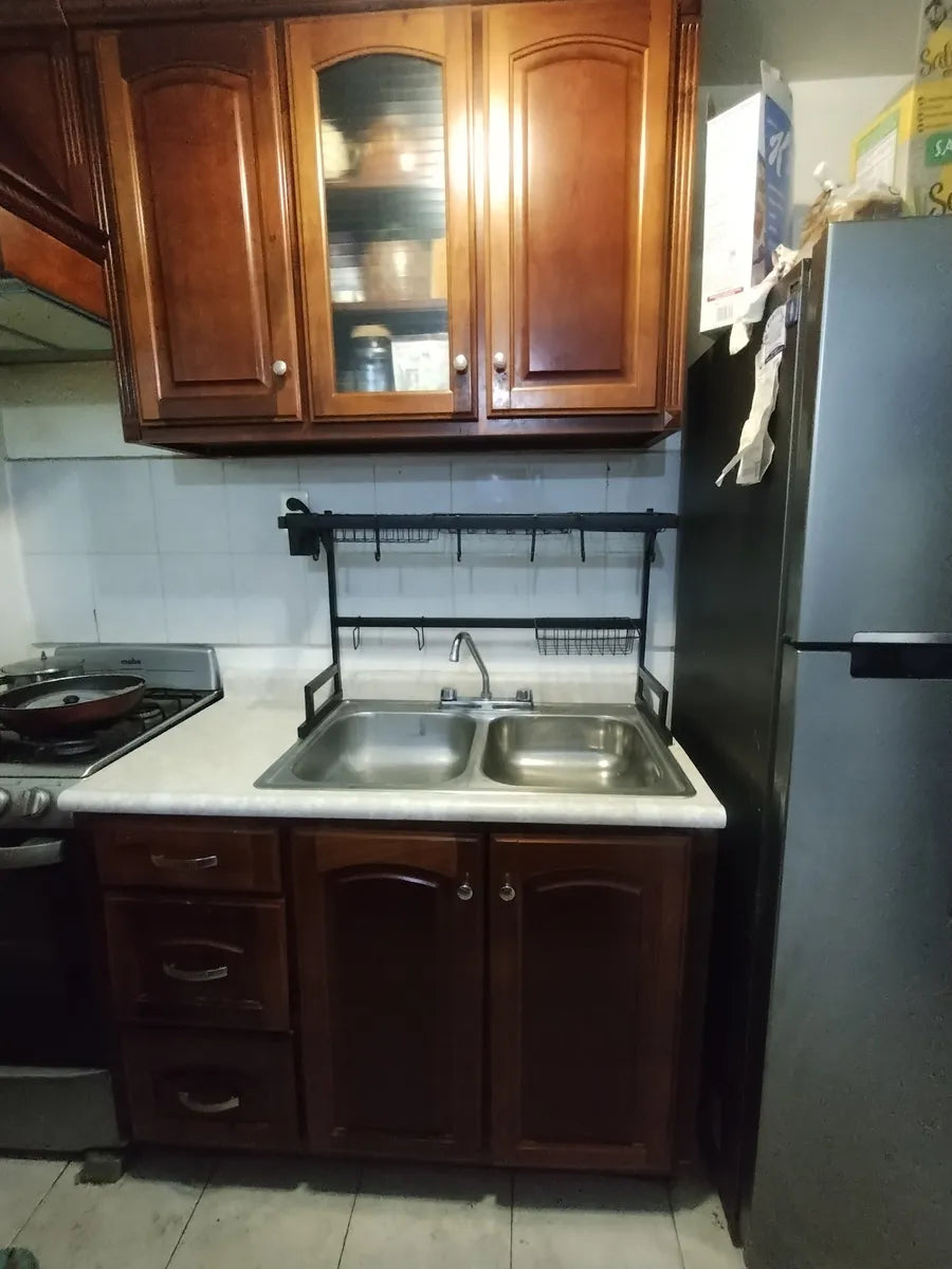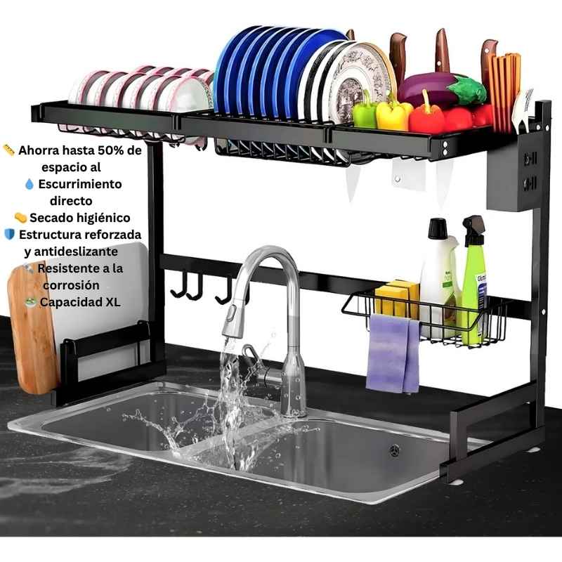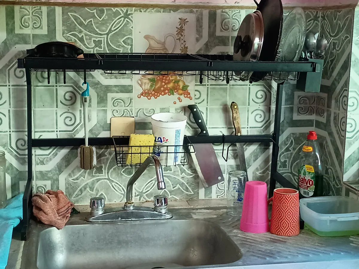 El diseño elevado permite que el agua escoja directo al fregadero, evitando humedad en la encimera. Además, todo queda ventilado y separado, lo que reduce malos olores y la formación de moho o bacterias en esponjas y utensilios.