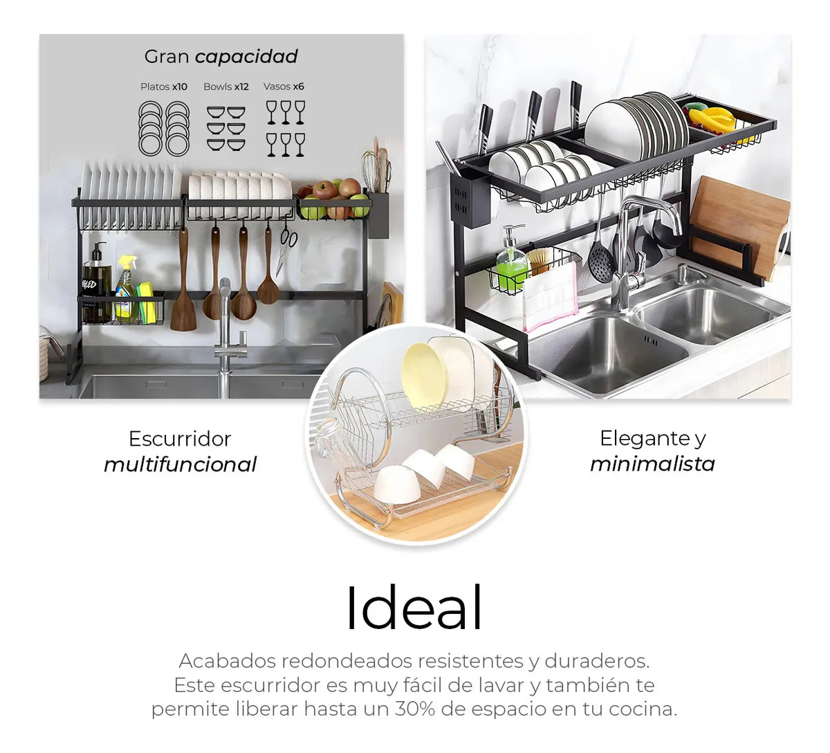 👉 El verdadero problema está en ese escurridor viejo que ocupa espacio, guarda humedad, acumula bacterias, provoca malos olores y deja tu encimera hecha un desastre.