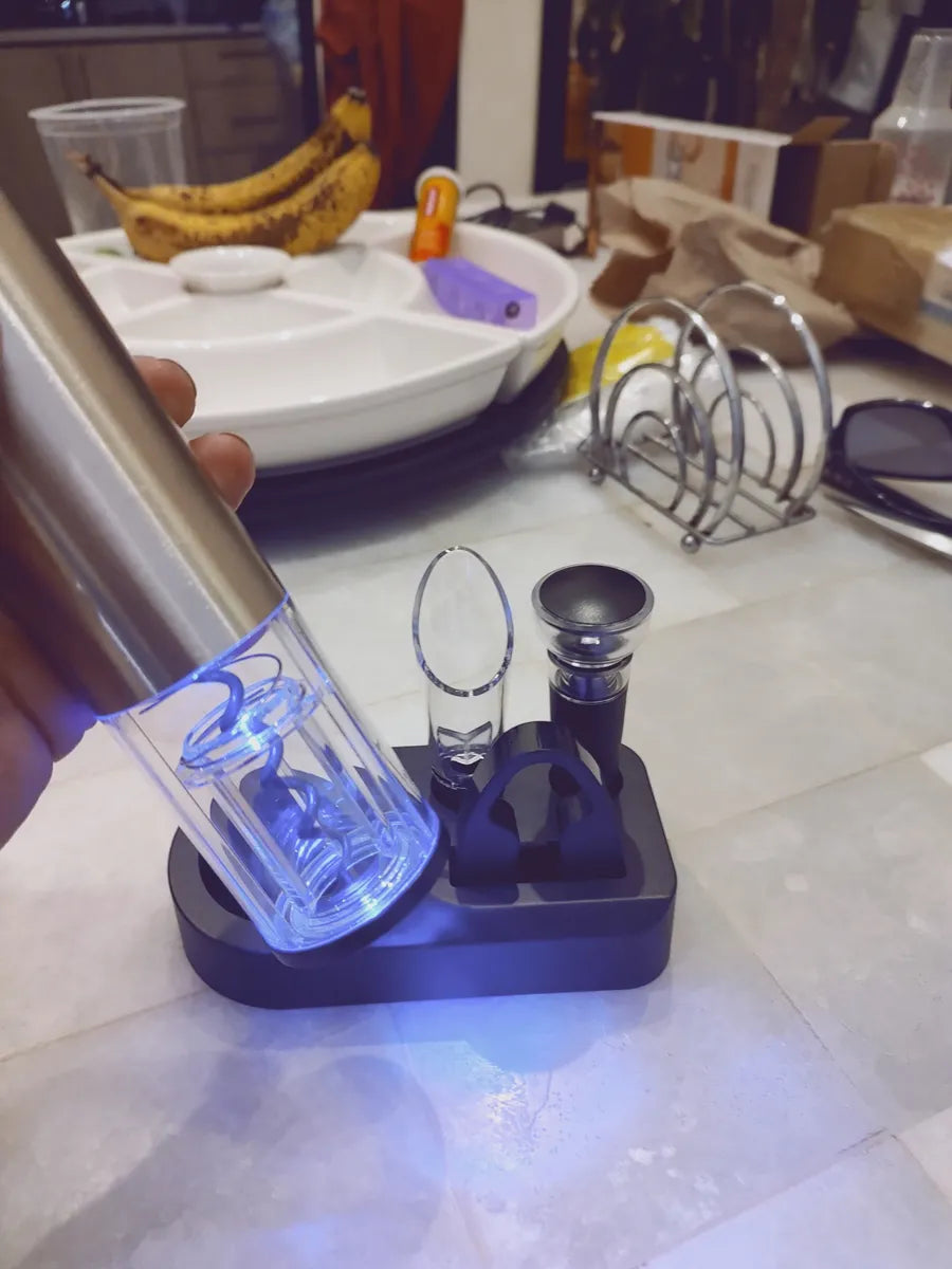 Motor silencioso, luz LED azul y accesorios esenciales para una experiencia completa: aireador, tapón al vacío, cortador, cable USB y base de carga.