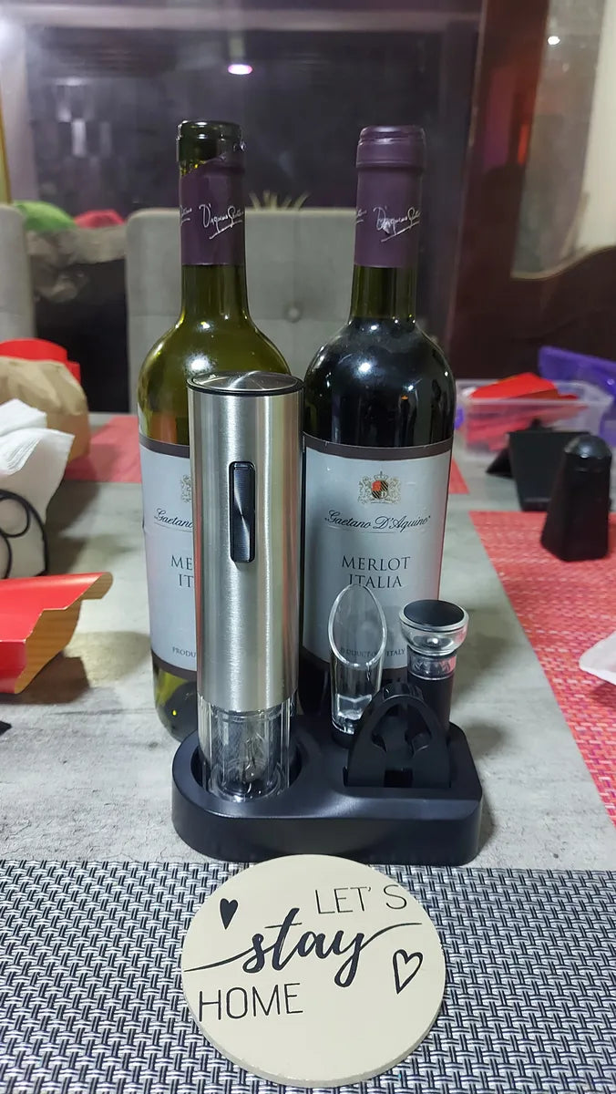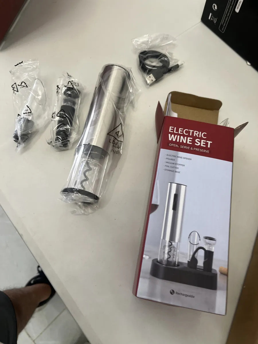 Desde que lo tengo, abrir una botella es rápido, fácil y elegante. Es recargable por usb, así que no tengo que preocuparme por pilas, y la batería dura bastante bien con varios usos. Me encanta que sea un kit 4 en 1: viene con el cortador de papel aluminio (que funciona perfecto), un vertedor que evita derrames, y dos tapones al vacío que conservan el vino fresco por más tiempo. Todo encaja perfectamente en la base, así que además de práctico, se ve ordenado y moderno. El sacacorchos en sí funciona muy suave, solo se presiona un botón y en segundos la botella está lista.